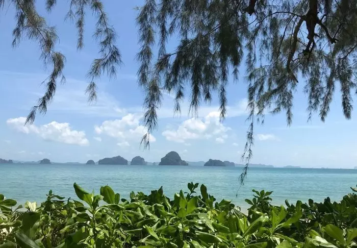 Der Strand ist ganz in der Nähe. Hier sehen Sie, wie die vielen Langboote zwischen Aonang und Railey hin- und herpendeln. Vom Strand aus hat man eine wunderschöne Aussicht auf die Andamanensee und die senkrecht aufragenden Kalksteinberge.