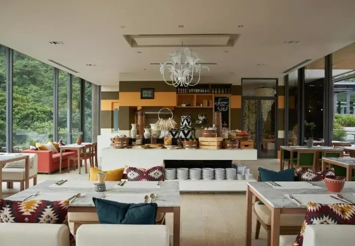 Im Hotelrestaurant Dum Ya, wo die asiatischen Currys besonders beliebt sind, können Sie eine köstliche Mahlzeit und den atemberaubendem Blick auf die Landschaft genießen.