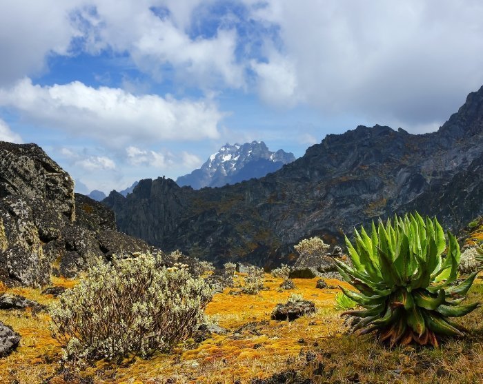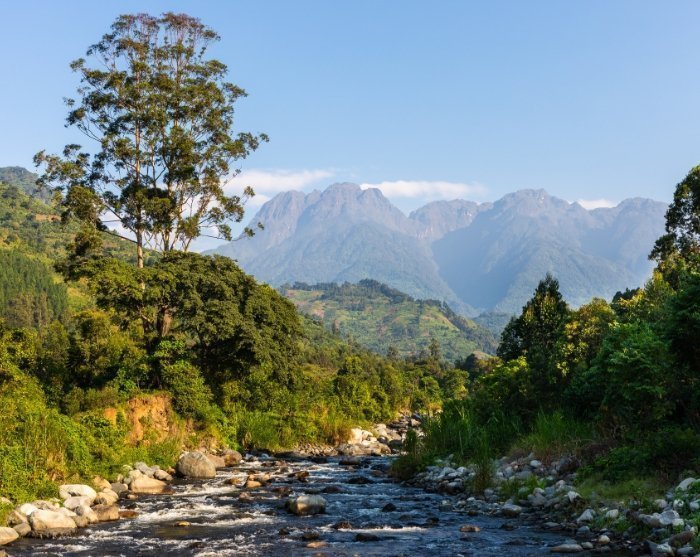 Von den Hügelketten rund um Kibale aus genießt man einen phänomenalen Blick auf die sanften, grünen Hügel mit den Ruwenzori-Bergen im Hintergrund.