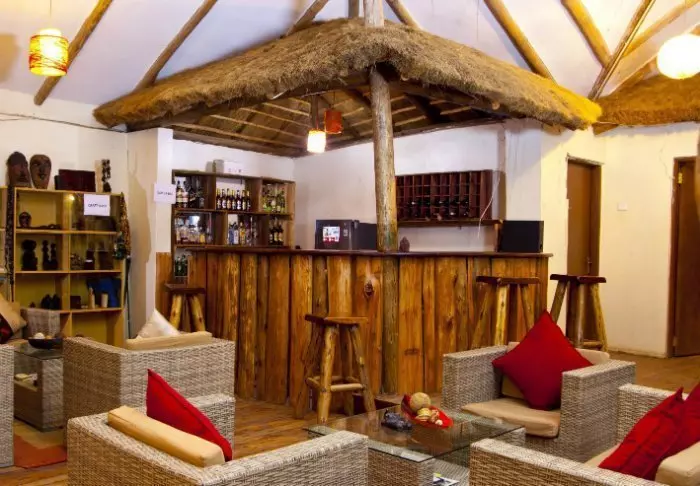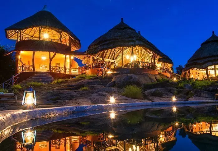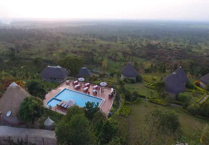 Die Lodge besteht aus „Bandas“-Hütten, die charakteristischen Hütten aus einem kleinen afrikanischen Dorf ähneln. Die Hütten sind auf den Hang verteilt. Einige davon besitzen zwei Etagen, von allen aber hat man eine herrliche Aussicht auf die Ebene und die traditionelle afrikanische Landschaft. Die Hütten sind mit 18 modernen Zimmern mit gemütlichen Betten und einem eigenen Badezimmer ausgestattet.