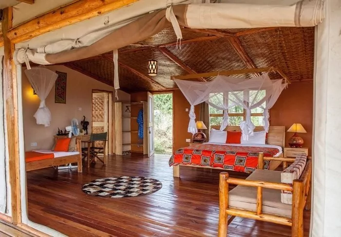 Die Lodge kombiniert Komfort mit authentischen Safari-Erlebnissen. Die eleganten Zimmer sind geschmackvoll im ostafrikanischen Stil eingerichtet und bieten moderne Annehmlichkeiten wie eine Klimaanlage, eine Kaffeemaschine und ein eigenes Bad.