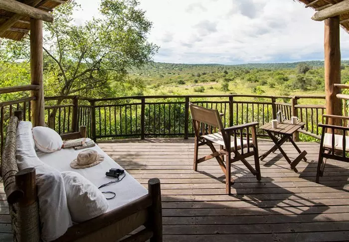 Der Pool befindet sich auf einem hölzernen Deck, das sich vom Rasen aus erstreckt, und bietet Sonnenliegen sowie einen herrlichen Ausblick. Am Abend wird ein Feuer entfacht, und mit einem lokalen Bier in der Hand können Sie Geschichten von der Safari des Tages austauschen.