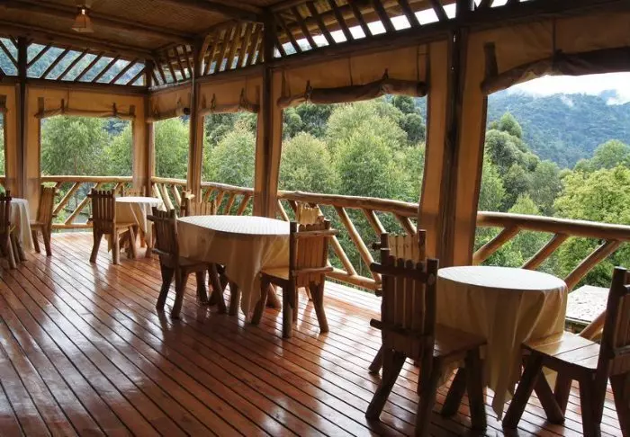 Zum Hauptgebäude gehört eine große Panoramaterrasse, die sich an der gesamten Vorderseite des Gebäudes entlang erstreckt. Von dort können Sie die Aussicht auf den Wald genießen, während Sie den Vögeln und dem plätschernden Fluss lauschen. Hier draußen können Sie zu den entspannenden Geräuschen der Natur auch Ihr Frühstück und Abendessen einnehmen oder einen Nachmittagstee trinken. Alternativ können Sie drinnen vor dem wärmenden Feuer des Kachelofens essen. Frühstück, Mittagessen, Nachmittagstee und Abendessen sind im Preis inbegriffen.