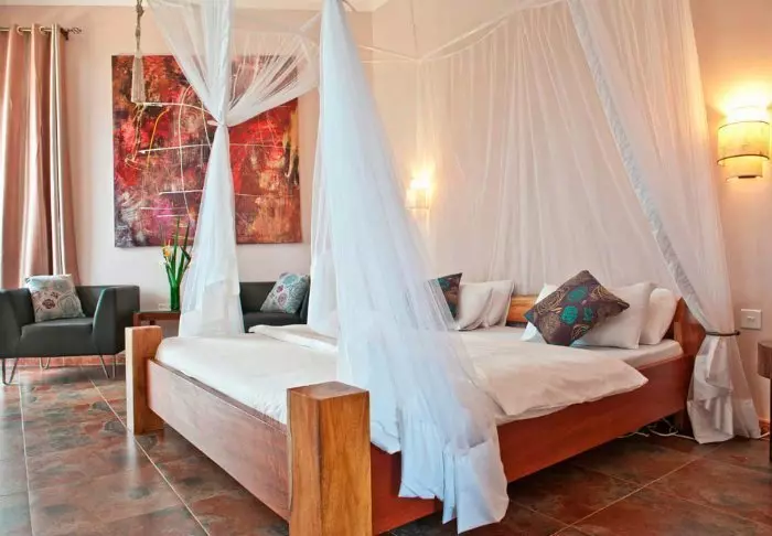 Im Hotel stehen lediglich 16 Zimmer zur Verfügung, was ihm eine herrlich heimelige und exklusive Atmosphäre verleiht. Alle Zimmer sind wunderschön mit bunter Kunst an den Wänden, dekorativen Möbeln und eleganten Moskitonetzen über den Betten eingerichtet. Jedes Zimmer verfügt darüber hinaus über ein eigenes Badezimmer, ein TV-Gerät sowie WLAN.