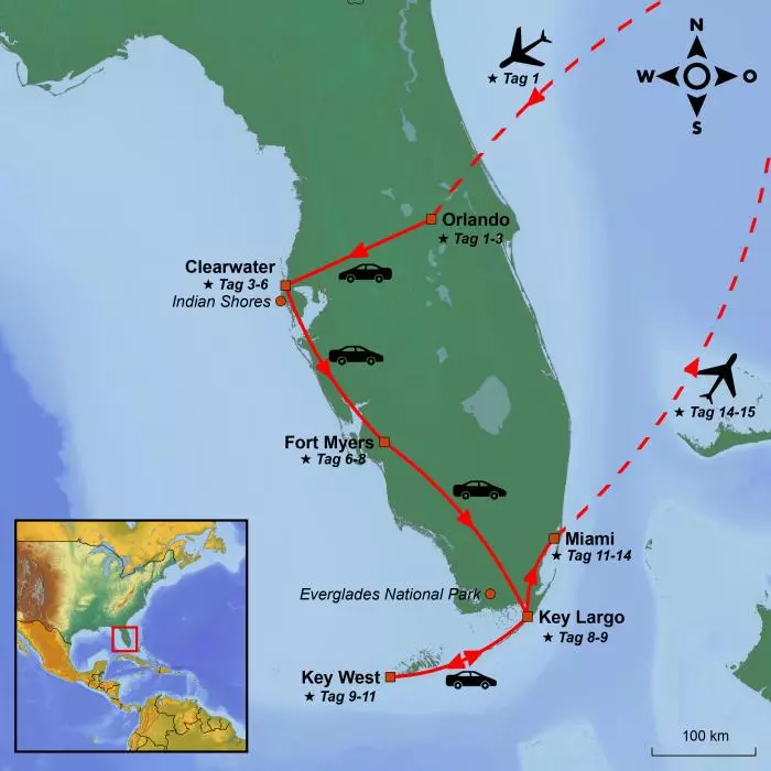 Heute begeben Sie sich auf die letzte Etappe Ihres Roadtrips, und die Fahrt zurück zum Festland ist nicht weniger schön, wenn Sie in Richtung Norden fahren. Falls Sie auf dem Weg nach Key West einen kleinen Umweg gemacht haben, haben Sie jetzt die Gelegenheit, die Orte zu besuchen, die Sie vor Ihrer Ankunft in Miami verpasst haben.