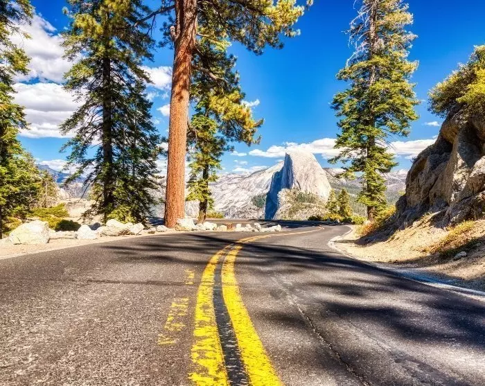 Wenn Sie sich dem Park über den Arch Rock Entrance nähern, werden Sie bemerken, wie das geschäftige Stadtleben San Franciscos allmählich abschwächt und nur noch karge Landschaften sowie die majestätischen Silhouetten der Sierra Nevada-Gebirgskette der Wüste übrig bleiben. Dort liegt der Yosemite Nationalpark. Die letzte Stunde Fahrt ins Yosemite Valley ist atemberaubend schön mit steilen Felswänden, dichten Kiefernwäldern und dem rauschenden Merced River, der die Straße parallel begleitet.