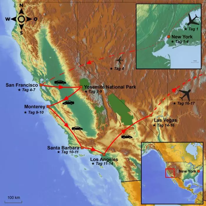 Heute wird der starke Kontrast deutlich, wenn Sie das Küstengebiet Kaliforniens für die Mojave-Wüste und die Spielerstadt Las Vegas im Bundesstaat Nevada verlassen. Von den Wolkenkratzern der Metropole bis zu kleinen Städten, Sanddünen und Steppenläufern, die langsam über die Straße rollen.