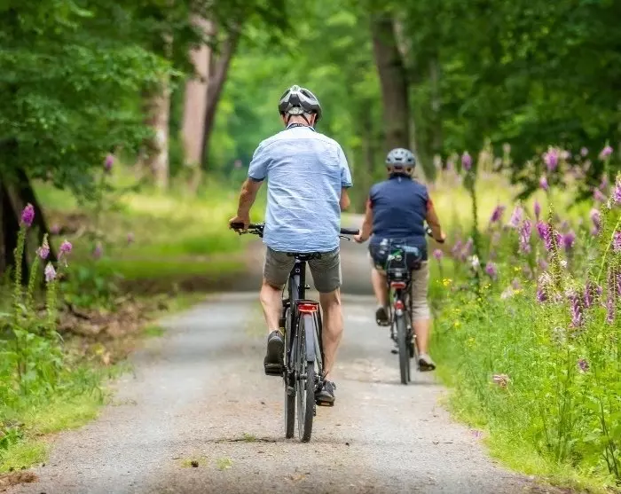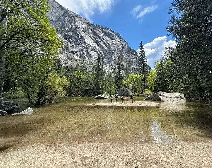 Im Yosemite Valley ist es auch möglich, ein Fahrrad zu mieten. Sie können die befestigten Radwege nutzen und von einem Wasserfall zum nächsten zu fahren, während Sie einfach den Blick auf die riesigen Felswände und Bäume um Sie herum genießen. Ein guter Platz für einen Snack ist der kleine Sandabschnitt im Picknickbereich der Swinging Bridge, wo Sie einen Blick auf den Wasserfall Yosemite Falls haben.