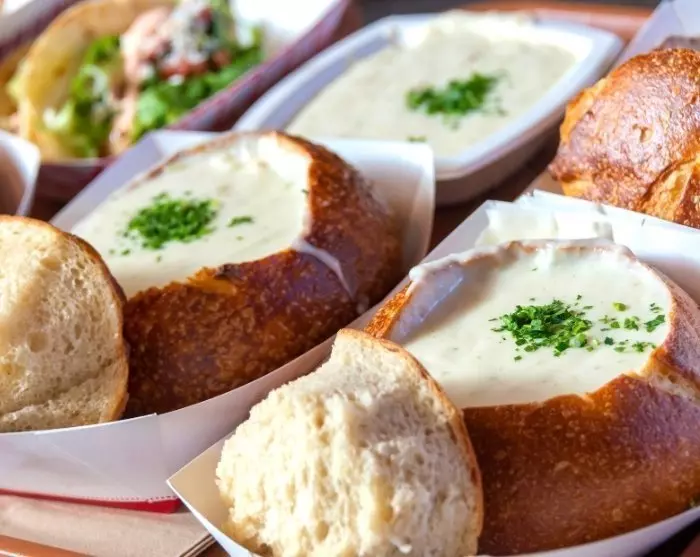 Beenden Sie den Tag mit dem köstlichen Gericht „Clam Chowder“ direkt am Wasser, mit Blick auf die Pelikane, die hier in Monterey Bay nach ihrem Abendessen tauchen.