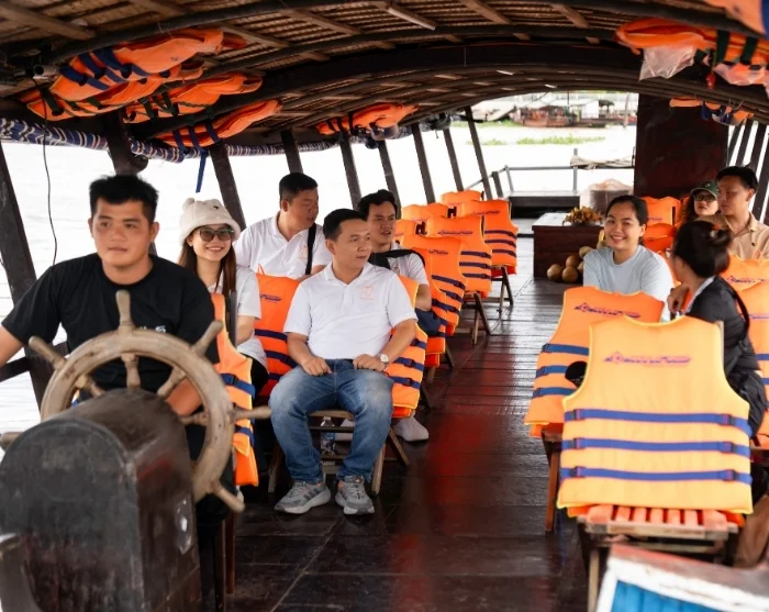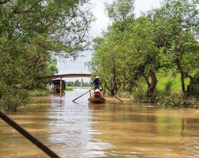 Nach einer etwa 2 1/2-stündigen Fahrt erreichen Sie die Stadt Cai Be. Dort gehen Sie an Bord eines Schiffes und legen ab zu einer Fahrt durch das üppige Mekongdelta. Sie besuchen lokale Werkstätten, in denen talentierte Kunsthandwerker Produkte aus Kokos herstellen. Anschließend fahren Sie in einem kleinen Sampan – einem traditionellen, geruderten Holzboot – durch die schmalen, mäandernden Kanäle des Mekong-Deltas.