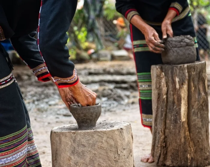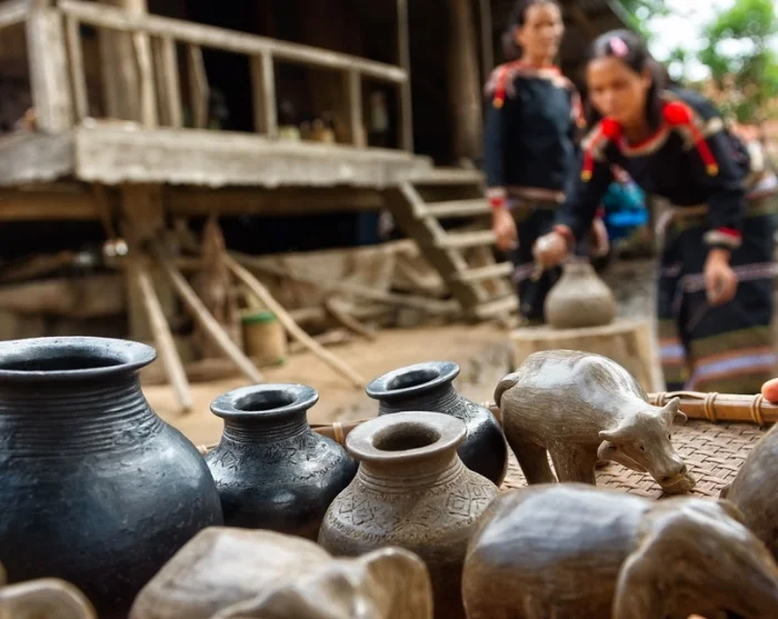 Nach dem Frühstück radeln Sie nach Yang Tao, einem etwa 12 km entfernten Dorf. Ihre Route führt Sie durch üppig grüne Reisfelder, in denen Sie unterwegs vielleicht Büffel- und Rinderherden beobachten können. Im Dorf erleben Sie die kunstvolle Herstellung der traditionellen M’nong-Keramik und besuchen Kakaoplantagen. Dort erwartet Sie eine besondere Kostprobe: der einzigartige, vergorene Kakaowein.