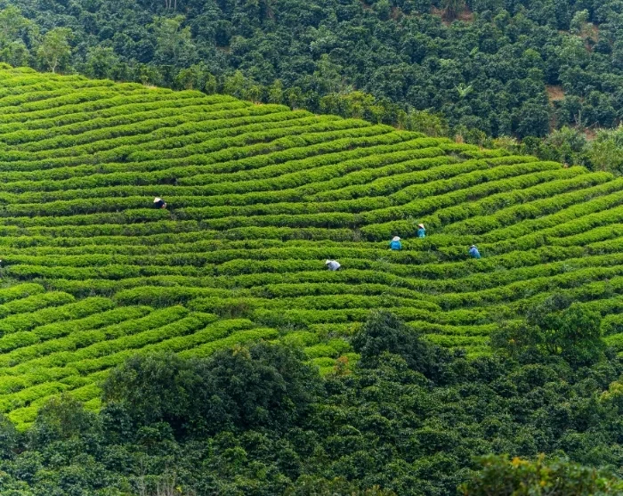 Der Tag beginnt mit einer Zugfahrt nach Trai Mat. Unterwegs können Sie die Panoramaaussicht über die wellenförmige Hügellandschaft von Da Lat genießen. Nach Ihrer Ankunft in Trai Mat erkunden Sie die Landschaft der Umgebung, bevor die Reise weiter zur Teeplantage Cau Dat mit ihren endlosen grünen Teebüschen geht. Hier werden Sie in den Prozess der Teeherstellung eingeführt und dürfen eine Tasse frisch zubereiteten Tee genießen, während Sie die beeindruckende Landschaft des Hochlandes in sich aufnehmen.