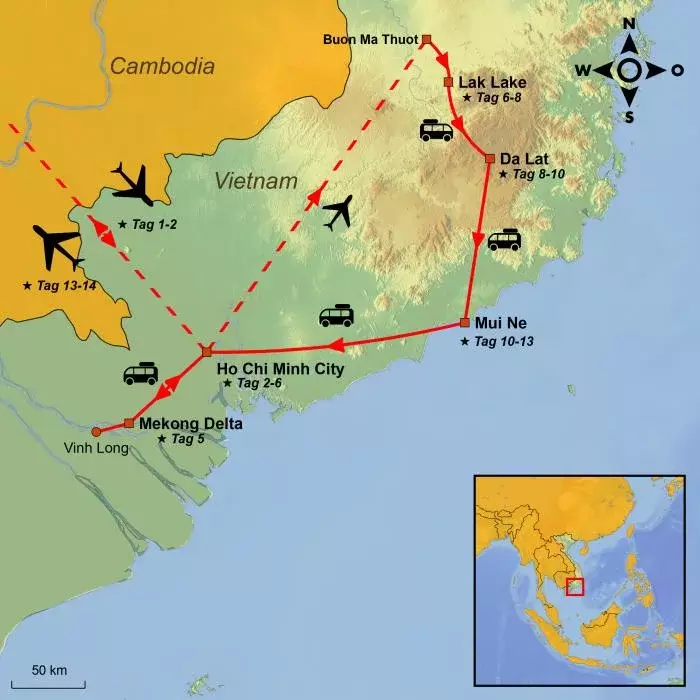 Der Tag steht zu Ihrer freien Verfügung, bis Sie nachmittags von Ihrem Hotel abgeholt und zum internationalen Flughafen Tan Son Nhat in Ho-Chi-Minh-Stadt gebracht werden. Von dort fliegen Sie nach Buon Ma Thuot im zentralen Hochland, etwa 350 km nordöstlich von Ho-Chi-Minh-Stadt. Der Flug dauert ca. 1 Stunden.