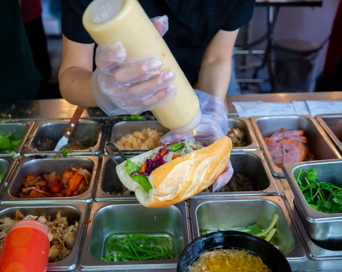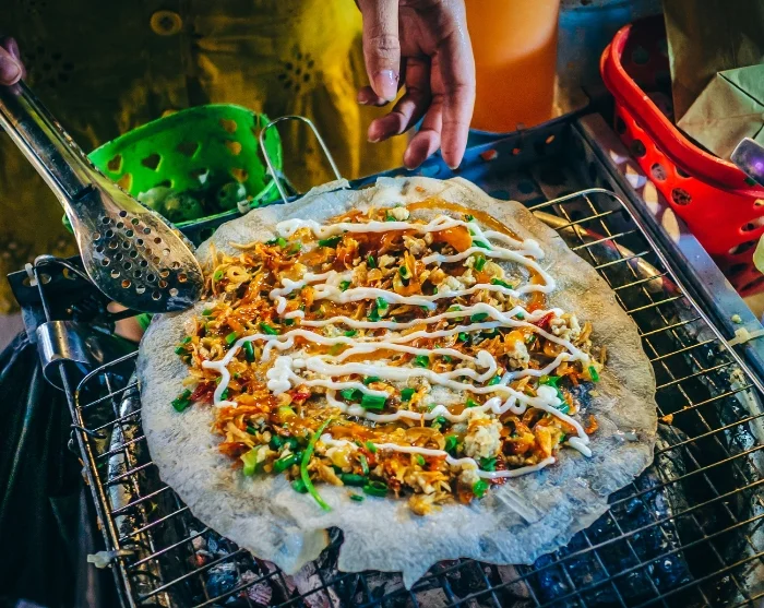 Von dort schlendern Sie langsam durch die Straße und erleben, wie kleine Pop-up-Restaurants nach und nach mit der eintretenden Dämmerung auftauchen. Halten Sie zwischendrin an, um die vietnamesische Reispapier-Pizza, Banh trang nuong, zu probieren, genauso wie das fabelhafte und knusprige vietnamesische Sandwich Banh mi, eine optimale Kombination französischer und vietnamesischer Geschmacksrichtungen.