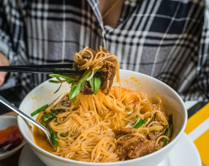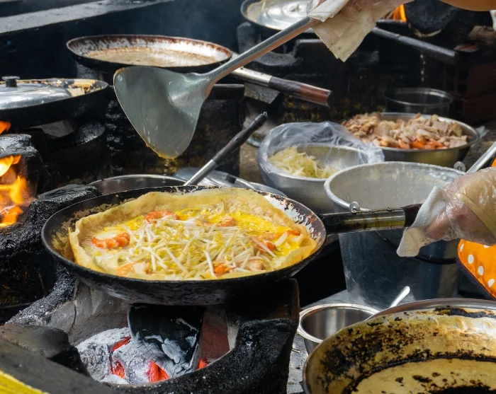 Ihr kulinarisches Abenteuer rundet eine Schale Hu tieu ab – ein Nudelgericht, das als Suppe, wie auch in einer trockenen Version erhältlich ist – und das beliebte Streetfood-Gericht Bot chien, das aus kleinen Reismehlwürfeln besteht: außen knusprig, innen weich, mit Ei und Frühlingszwiebel gebraten und mit einer süß-säuerlichen Sauce auf Sojabasis und frisch geriebener Papaya. Ein einfaches, aber sehr schmackhaftes Gericht, das viele Einheimische als späten Snack essen.