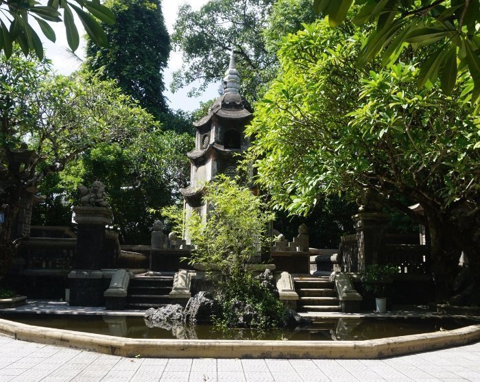 Ihr Guide holt Sie von Ihrem Hotel ab und bringt Sie zur friedlichen Bao Quoc-Pagode, einem historischen buddhistischen Tempelkomplex, der idyllisch am Ufer des sogenannten Parfümflusses liegt. Die im 17. Jahrhundert gegründete Pagode ist bekannt für ihre ruhige Atmosphäre und traditionelle Architektur. Der Tempelkomplex besticht durch wunderschöne Bauwerke und Pavillons, umgeben von grünen Gärten und uralten Bäumen. Dies macht ihn zu einem idealen Ort für Meditation und innere Ruhe. Der Haupttempel beeindruckt mit einer imposanten Fassade, während Sie im Inneren kunstvolle Dekorationen mit buddhistischen Statuen und Kunstwerken entdecken, die die Tiefe des Buddhismus widerspiegeln. Zusätzlich fungiert die Bao Quoc-Pagode als wichtiges Bildungszentrum für buddhistische Mönche, die dort buddhistische Schriften studieren und sich intensiv mit der Philosophie sowie der Praxis des Buddhismus auseinandersetzen.